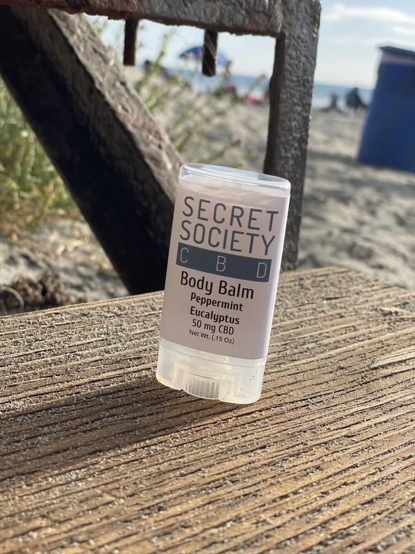 Cocoa butter, Shea Butter, Mango BUtter, Beeswax, 50 mg of CBD, Peppermint Oil, Eucalyptus Oil, & Lemon Balm